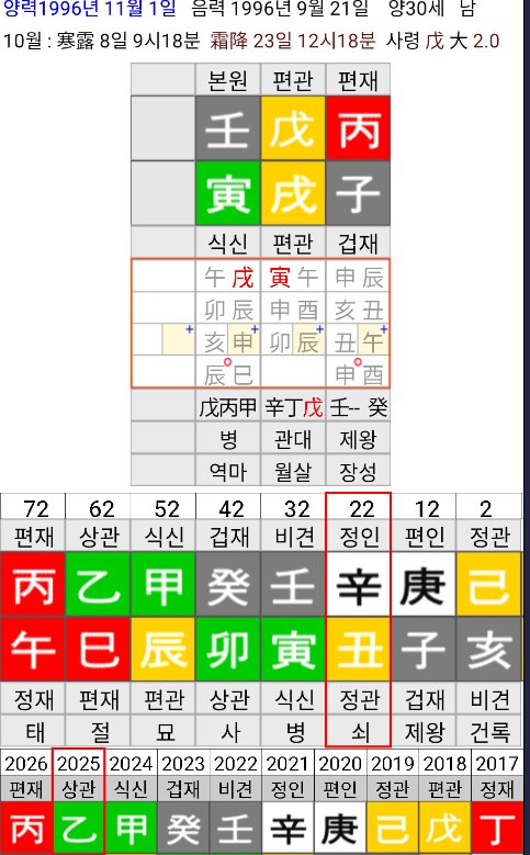 | 월주 해석 | 무술(戊戌) – 명예와 자존심을 중시, 책임감과 품격을 가진 편관의 기운 |